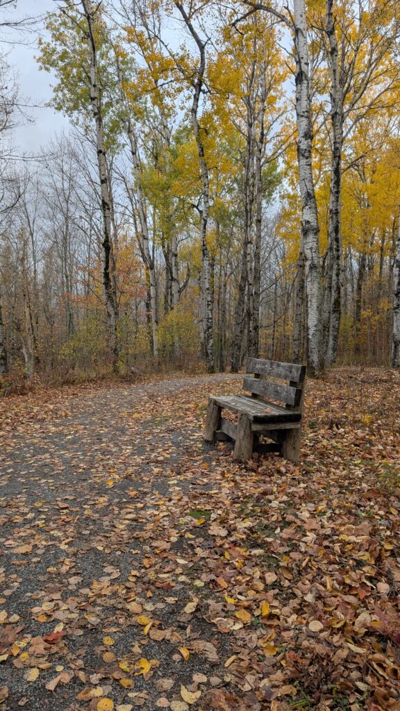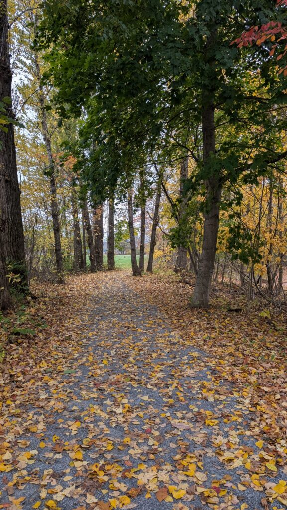 There are plenty of benches along the trail, perfect for taking a break, sharing a snack, or just sitting quietly to enjoy the scenery. About halfway along, we came across the Sussex Bark Park, a fenced dog park tucked beside the walkway. No dogs were visiting today, but I was more interested in what surrounded it—huge, open fields for disc golf! The grass went on forever, and I couldn’t help imagining how much fun it would be to chase a frisbee there. Next time, we’re definitely bringing one. (Note to self: practice catching.)